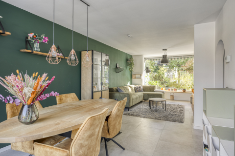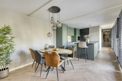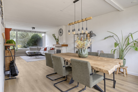 De woonkamer biedt genoeg ruimte voor een grote eettafel én een gezellige zithoek.